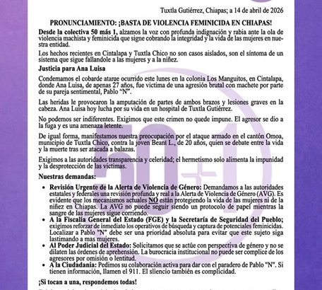 De igual forma, manifestamos nuestra preocupación por el ataque armado en el cantón Omoa, municipio de Tuxtla Chico, contra la joven Beani L., de 20 años, quien se debate entre la vida y la muerte tras ser atacada a balazos.