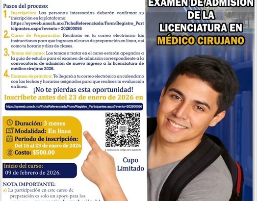 Cabe destacar que la participación en este curso de preparación es solo un apoyo para los aspirantes y no garantiza el acceso a la carrera, dado que el ingreso a la Licenciatura en Médico Cirujano dependerá de los resultados obtenidos en el examen de admisión, así como del cumplimiento de las etapas establecidas en la convocatoria de nuevo ingreso a este programa académico.