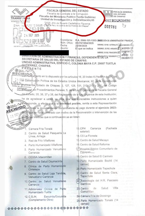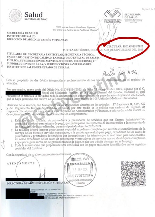 2) De acuerdo a la circular IS/DAF/151/2025 de la Secretaría de Salud del Estado de fecha 25 de septiembre de este año, se instruye «con carácter de urgente» a las áreas de la Secretaría atender la petición de la Fiscalía Anticorrupción de la Fiscalía General del Estado y del Ministerio Público. La Fiscalía requiere la lista de proveedores, la copia de los expedientes de entrega de las obras en caso de existir.