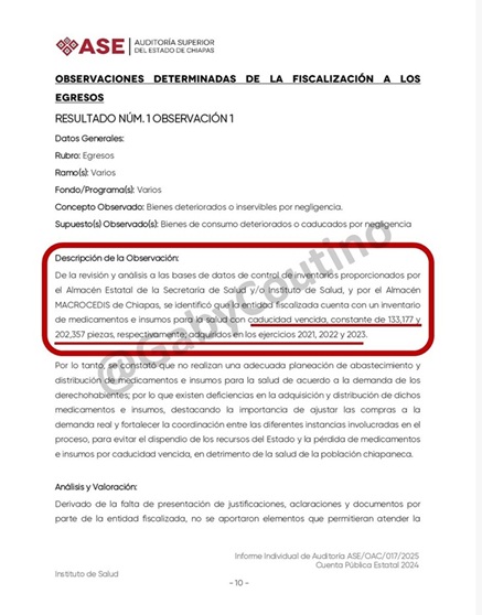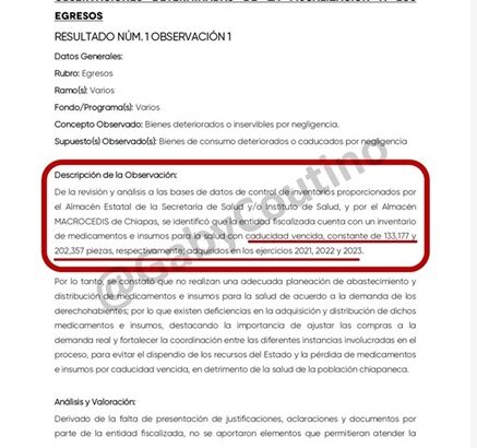 La Auditoría de Cumplimiento ASE/OAC/017/2025 de la Cuenta Pública Estatal del 2025 correspondiente a la Secretaría de Salud del Estado de Chiapas en el resultado número 1 y su observación número 1 también identificó que “la entidad fiscalizada cuenta con un inventario de medicamentos e insumos para la salud con caducidad vencida, constante de 133,177 y 202,357 piezas, respectivamente; adquiridos en los ejercicios 2021, 2022 y 2023”.