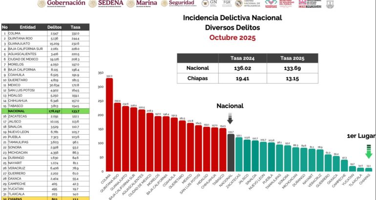 El Fiscal General del Estado, Jorge Luis Llaven Abarca, destacó que, según el Secretariado Ejecutivo del Sistema Nacional de Seguridad Pública, de enero a octubre de 2025, Chiapas se encuentra en segundo lugar a nivel nacional en disminución de incidencia delictiva general, con una puntuación de 160.5, sólo por debajo de Tlaxcala con 150.3; una cifra muy por debajo de la media nacional que es de mil 280 delitos por cada 100 mil habitantes.