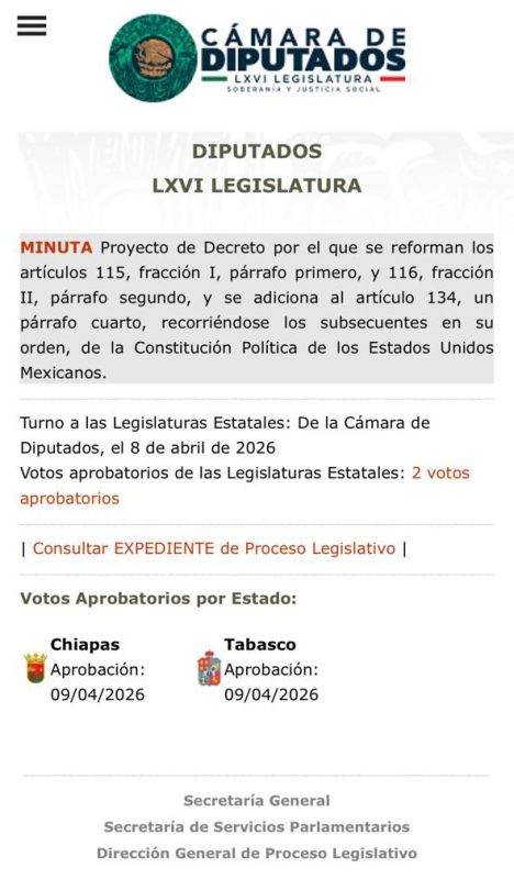 De acuerdo al portal de la Cámara de Diputados, el Congreso de Chiapas decidió en unidad, ser el primero en aprobar por mayoría el proyecto de decreto por el que se reforman los artículos 115, fracción I, párrafo primero, y 116, fracción II, párrafo segundo, y se adiciona al artículo 134, un párrafo cuarto, recorriéndose los subsecuentes en su orden, de la Constitución Política de los Estados Unidos Mexicanos.