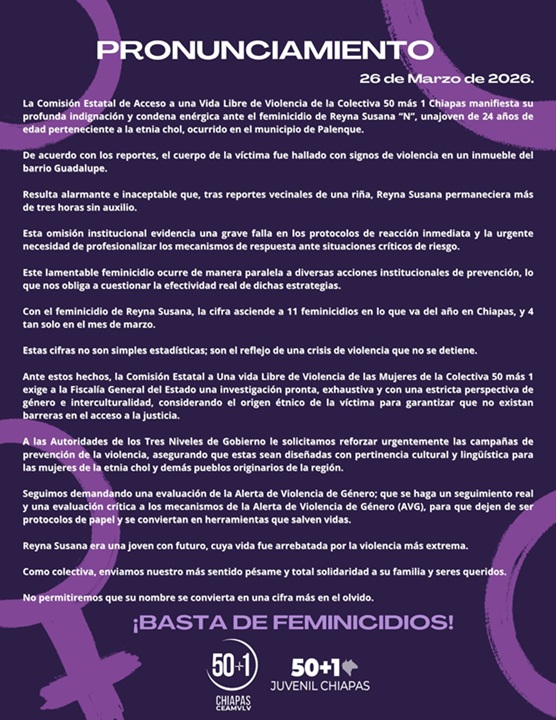 La Comisión Estatal de Acceso a una Vida Libre de Violencia de la Colectiva 50 más 1 Chiapas manifiesta su profunda indignación y condena enérgica ante el feminicidio de Reyna Susana “N”, unajoven de 24 años de edad perteneciente a la etnia chol, ocurrido en el municipio de Palenque.