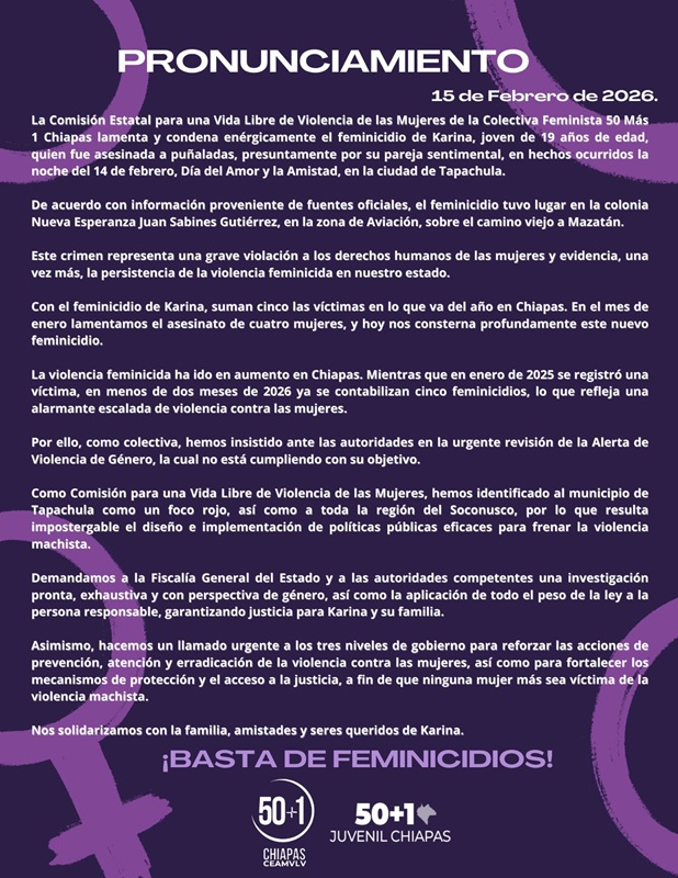 La Comisión Estatal para una Vida Libre de Violencia de las Mujeres de la Colectiva Feminista 50 Más 1 lamenta y condena enérgicamente el feminicidio de Karina, joven de 19 años de edad, quien fue asesinada a puñaladas, presuntamente por su pareja sentimental, en hechos ocurridos la noche del 14 de febrero, Día del Amor y la Amistad, en la ciudad de Tapachula.