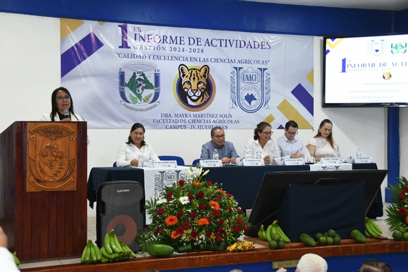 Huehuetán, Chiapas. – Rindió su 1er. Informe de Actividades, Gestión 2024-2028, la director de la Facultad de Ciencias Agrícolas, Campus IV, de la Benemérita Universidad Autónoma de Chiapas, Mayra Martínez Solís, ante los integrantes de la Junta de Gobierno, la comunidad docente y estudiantil de esta unidad académica.