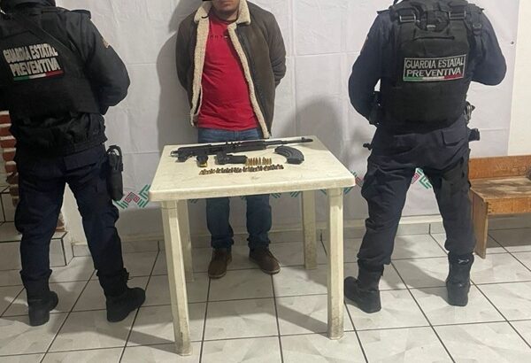 Resultado de patrullajes de prevención, disuasión del delito y proximidad social en el barrio Guadalupe del citado municipio, guardias estatales aplicaron control preventivo de detención a Omar “N”, quien conducía un vehículo marca Toyota tipo Hilux de color negro, con reporte de robo. Mismo al que le aseguraron un arma de fuego tipo fusil AK-47 y una pistola tipo escuadra calibre 9 milímetros, dos cargadores con 45 cartuchos útiles.
