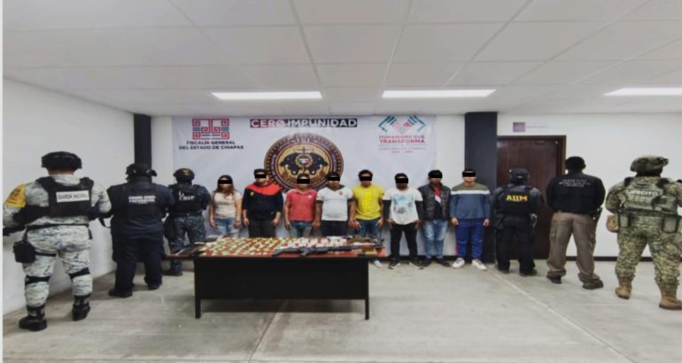 La Fiscalía General del Estado, en coordinación con la Secretaría de la Defensa Nacional, la Fiscalía General de la República, la Guardia Nacional y la Secretaría de Seguridad del Pueblo, detuvieron a Rashell “N”, Raúl “N”, José “N”, Aurelio “N”, Mauricio “N”, Porfirio “N”, Miguel “N” y Jesús “N”; estos últimos dos originarios del estado de Oaxaca, como presuntos responsables de los delitos de narcomenudeo, con la variante de posesión con fines de comercio del narcótico conocido como metanfetamina, así como de portación de arma de fuego sin licencia de uso exclusivo de las fuerzas armadas, por hechos ocurridos en el municipio de Cintalapa de Figueroa.