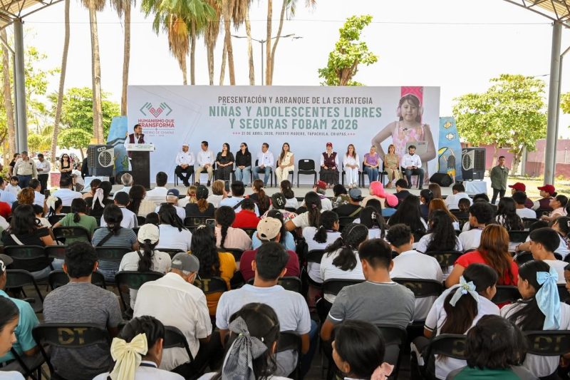Más tarde, en Puerto Madero, el gobernador presenció la presentación y el arranque de la estrategia Niñas y Adolescentes Libres y Seguras, del Fondo para el Bienestar y el Avance de las Mujeres (Fobam), un programa del Gobierno de México enfocado en establecer una intervención territorial en las comunidades para prevenir y erradicar las causas del embarazo infantil y las uniones tempranas.