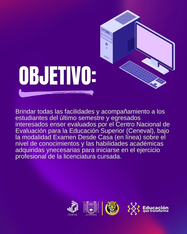 Dicha práctica tiene como objetivo brindar todas las facilidades y acompañamiento a los estudiantes del último semestre y egresados interesados en ser evaluados por el Centro Nacional de Evaluación para la Educación Superior (CENEVAL), en la modalidad Examen Desde Casa (en línea).