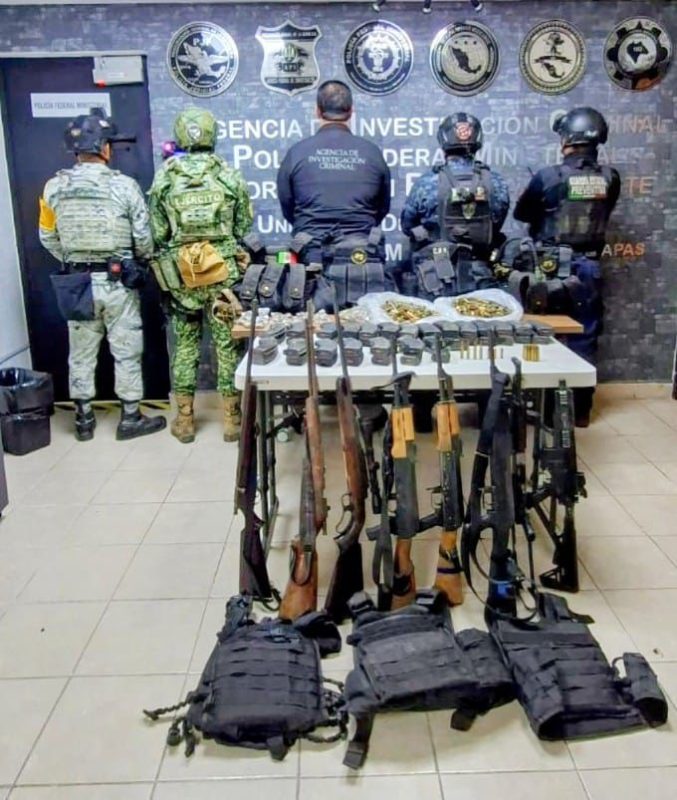 Los hechos se registraron en la comunidad Joaquín Miguel Gutiérrez, donde como resultado de recorridos estratégicos, se logró el aseguramiento de tres armas largas tipo AK-47 calibre 7.62×39; dos armas largas Colt R-15 calibre .223; dos armas largas calibre .22 y un arma larga calibre .308. Asimismo, se aseguraron mil 324 cartuchos calibre 7.62×39, 23 cartuchos calibre .223 y cuatro cartuchos calibre .308, además de 42 cargadores para arma larga; además, se localizaron siete chalecos balísticos y 21 envoltorios que contenían hierba verde y seca con características propias de la marihuana.
