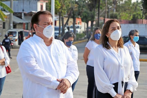En la Plaza de la Constitución de Villaflores, y tomando en cuenta las recomendaciones de la Secretaría de Salud, elementos de la Guardia Nacional llevaron en sus hombros la bandera para izarla a toda asta, para rendir el homenaje para despues entonar los himnos Nacional y de Chiapas.
