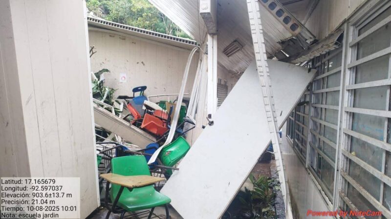 Personal de Protección Civil de Simojovel mantiene presencia en el lugar, realizando la evaluación de daños y emitiendo recomendaciones de seguridad para salvaguardar la integridad de la comunidad escolar.