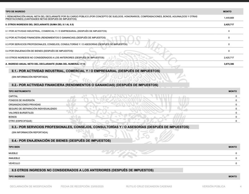 El exgobernador de Chiapas, Rutilio Escandón Cadenas, percibe más de tres millones 875 mil pesos mensuales en ingresos producto de las “rentas” de inmuebles de su propiedad, de acuerdo a su declaración patrimonial, exhibida por Hugo Álvarez en redes sociales y aun así; es cónsul aunque no lo necesita, pero ello, le permite inmunidad, poder y evadir la justicia con respaldo de la 4T.