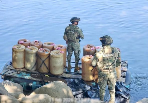 Suchiate, Chiapas, 13 de febrero de 2026.- Luego de realizar patrullajes de vigilancia en la zona limítrofe de Chiapas con Guatemala, personal de la Secretaría de Marina Armada de México aseguró más de 1000 litros de diésel, los cuales estaban abandonados en una balsa en el río Suchiate.