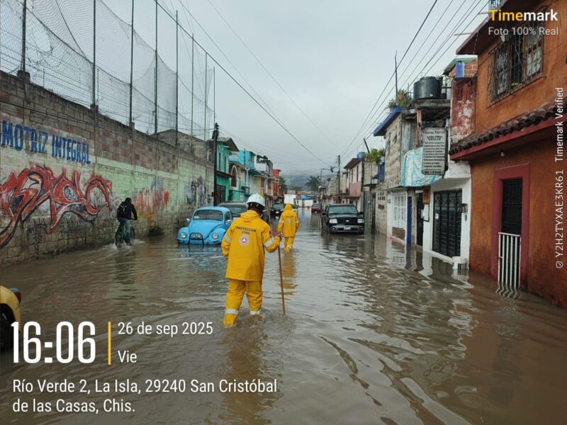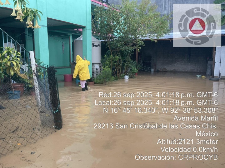 En #sancristobaldelascasaschiapas el arroyo que cruza la Calzada Tlaxcala alcanzó hasta un 90% de su capacidad, generando encharcamientos en calles aledañas como América Libre, Julián Villagrán, Rosario Castellanos y Rivera, por lo que fue necesario acordonar la zona.