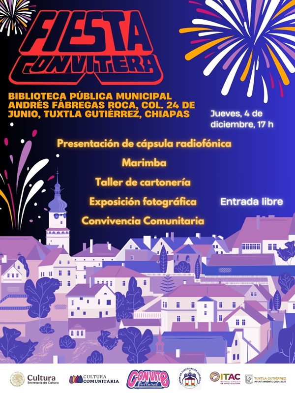 Invitan a las y los habitantes a participar en las celebraciones “Fiesta Convitera”, que se llevarán a cabo bibliotecas públicas municipales de Tuxtla Gutiérrez, las cuales buscan fortalecer la participación ciudadana y garantizar el acceso libre a la cultura.