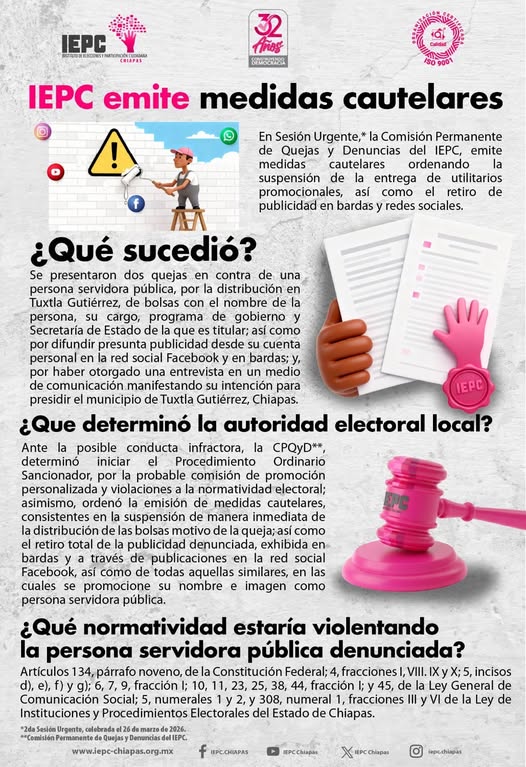 Asimismo, la Comisión Permanente de Quejas y Denuncias del #IEPC, emitió medidas cautelares consistentes en la suspensión de la entrega de material promocional, así como el retiro inmediato de publicidad en bardas y redes sociales.