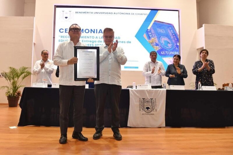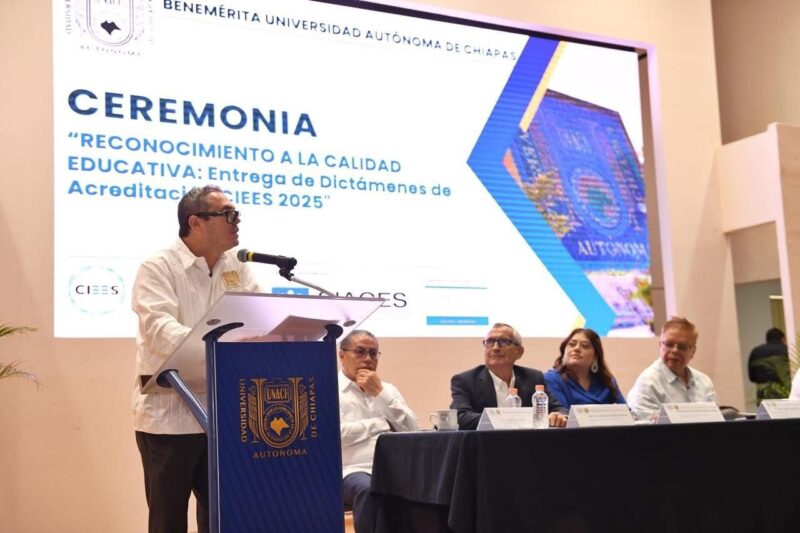 Tuxtla Gutiérrez, Chiapas.- El Coordinador General de los Comités Interinstitucionales para la Evaluación de la Educación Superior, Miguel Ángel Tamayo Taype, entregó al rector de la Benemérita Universidad Autónoma de Chiapas, Oswaldo Chacón Rojas, las acreditaciones de 44 programas educativos de 22 unidades académicas, en evento realizado en el auditorio Los Constituyentes, con lo que fue reconocida como la institución de educación superior del país con más programas acreditados en calidad en 2025.